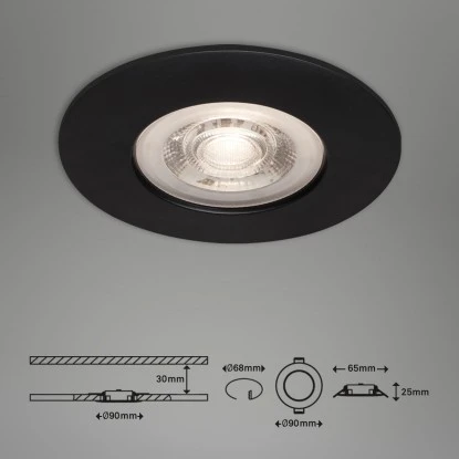 Die schwarze, ultraflache Brilo LED-Einbauleuchte der Serie Kulana hat eine fest verbaute LED-Platine mit 5 Watt und einer Lichtleistung von 460 Lumen. Die Leuchte hat eine warmweiße Lichtfarbe und ist mit der Schutzart IP44 vor Spritzwasser geschützt und somit auch für Badezimmer geeignet. Die Einbauleuchte kommt im praktischen Dreierset. Das Einbaumaß hat einen Durchmesser von 68 mm und die Einbauhöhe beträgt 30 mm.