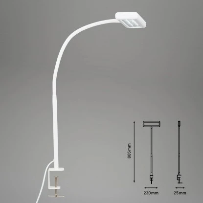 Die weiße Brilo Klemmleuchte der Serie Trasna eignet sich perfekt für Ihr Homeoffice. Sie kann durch ihre Klemme beliebig platziert und fixiert werden und bietet somit verschiedenste Montagemöglichkeiten. Die eingebaute Platine kommt mit einer Leistung von 7,5 Watt und 800 Lumen. Mit 6.500 K erstrahlt sie in hellem Tageslicht. Die Leuchte hat die Maße 805 mm x 230 mm x 40 mm.