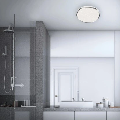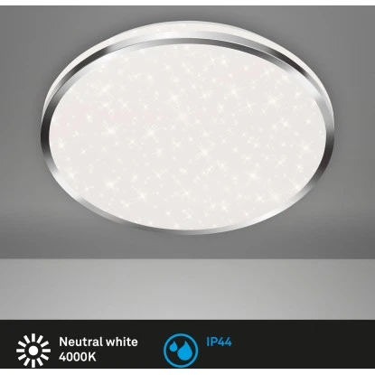 Die Briloner LED-Deckenleuchte Acorus verzaubert jedes Badezimmer mit ihrem Sterneneffekt. Die eingebaute LED-Platine hat eine Leistung von 18 Watt und 1.800 Lumen. Mit einer Lichttemperatur von 4.000 Kelvin strahlt die Deckenleuchte ein angenehm neutralweißes Licht aus. Die Leuchte hat eine lange Lebensdauer von 25.000 Stunden. Durch den Schutzfaktor IP44 kann die Deckenleuchte problemlos in der Nähe von Waschbecken oder Dusche angebracht werden, da sie spritzwassergeschützt ist.