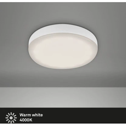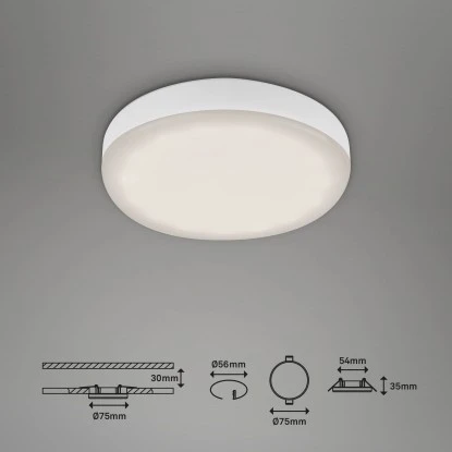 Die weiße, rahmenlose Briloner LED-Einbauleuchte der Serie Plat hat eine fest verbaute LED-Platine mit 3 Watt und einer Lichtleistung von 350 Lumen. Die Leuchte hat eine neutralweiße Lichtfarbe und ist mit der Schutzart IP44 vor Spritzwasser geschützt und somit auch für Badezimmer geeignet. Das Einbaumaß hat einen Durchmesser von 68 mm und die Einbauhöhe beträgt 30 mm.