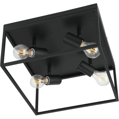 Die Deckenleuchte Silentina besteht aus einem quaderförmigen Metall-Rahmen in Schwarz, der einen direkten Blick auf die vier, innenliegenden Leuchtmittel ermöglicht. Die Deckenlampe rundet moderne Einrichtungsstile optimal ab und bietet eine passende Beleuchtung in der Küche, im Wohnzimmer, Schlafzimmer oder Flur. Die abgebildeten Filament-Leuchtmittel sind nicht im Lieferumfang enthalten. Geeignet ist die Leuchte für jedes Leuchtmittel mit E27-Sockel.
