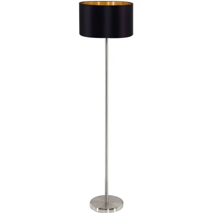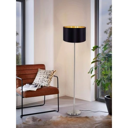 Die Stehleuchte Maserlo ist mit einem runden, schwarzen Textil-Lampenschirm mit einer goldfarbenen Innenseite und einem nickel-matten Metallfuß gefertigt. Die Stehlampe fügt sich optimal in minimalistische und moderne Einrichtungen ein. Ein bequemes Ein- und Ausschalten ist über einen Fußtrittschalter am Kabel möglich. Sie bietet eine wohnliche Beleuchtung für jeden Raum – egal ob im Schlafzimmer, Wohnzimmer oder Esszimmer. Das Leuchtmittel ist nicht im Lieferumfang enthalten. Geeignet ist die Leuchte für jedes Leuchtmittel mit E27-Sockel.