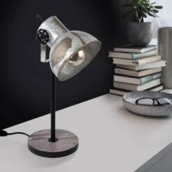 Die Tischleuchte Barnstaple besteht aus einem runden Metall-Fuß mit einer braunen Holzdekor-Optik und einem umliegenden Metallband in Schwarz. Der bewegliche Leuchtenkopf im verzinkten Used-Look und die seitlich daran angebrachten Feststellschrauben in Schwarz runden das rustikale Design der Leuchte ab. Ebenso ist ein bequemes Ein- und Ausschalten über einen Schalter am Kabel möglich. Die Tischlampe fügt sich nahtlos in den Industrial-Trend ein und ist dank des schwenkbaren Leuchtenkopfes optimal für jeden Raum geeignet – egal ob im Schlafzimmer auf dem Nachttisch, Wohnzimmer, Esszimmer oder im Flur. Das abgebildete Filament-Leuchtmittel ist nicht im Lieferumfang enthalten. Geeignet ist die Leuchte für jedes Leuchtmittel mit E27-Sockel.