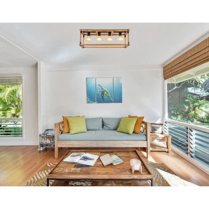 Diese schöne Deckenleuchte beeindruckt durch ihr tolles Design. In einem 80×25 cm großen Holzgerüst mit Hanfseil Verzierungen befinden sich 4 E27 Fassungen welche an der Decke mit einer schwarz matten Metallstange befestigt sind. Die E27 Fassungen ermöglichen Ihnen die freie Auswahl, bis zu einer maximalen Leistung von 60 Watt, über Ihr Leuchtmittel.