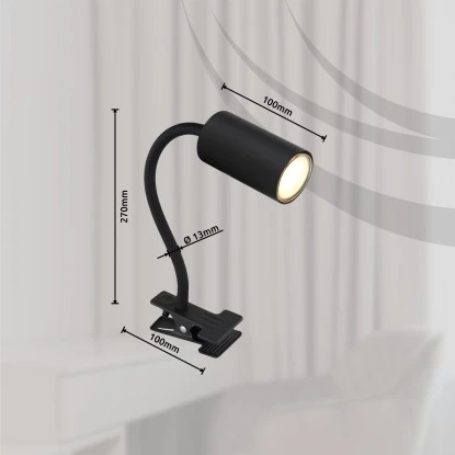 Der kleine klassische Klemmstrahler Robby ist hergestellt aus schwarzem Kunststoff und schwarz mattem Metall. Er verfügt über einen Schalter, welcher das Ein- und Ausschalten der Lampe ermöglicht und ist zudem auch beweglich (flexo). Die GU10 Fassung überlässt Ihnen die Wahl des Leuchtmittels (max.25W) und somit auch die Lichtstärke und Lichtfarbe. Aufgrund ihrer Langlebigkeit und Stromersparnis empfehlen wir LED-Lampen.
