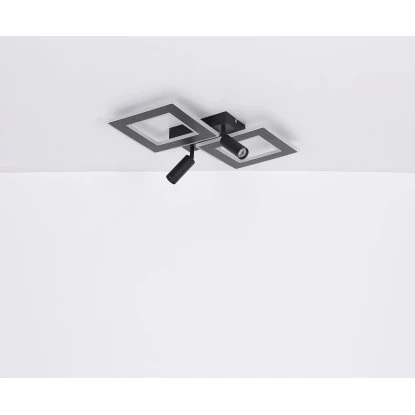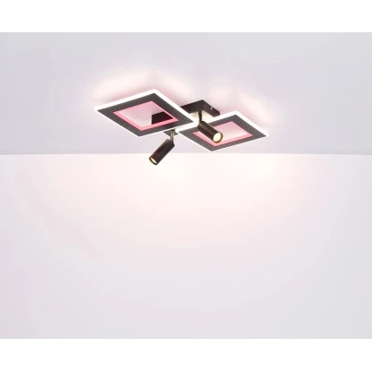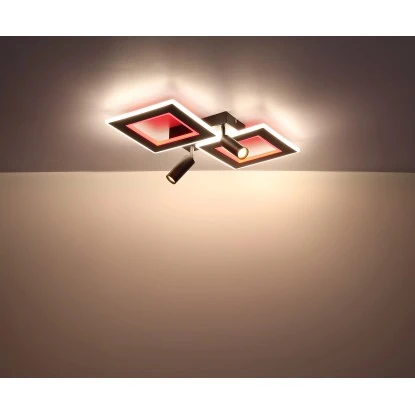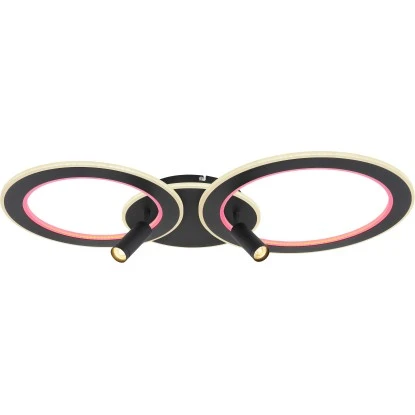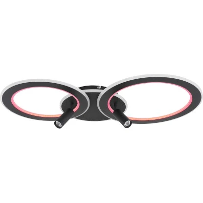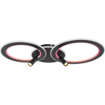 Die Leuchte besteht aus drei formschönen Ringen welche mit zwei zylinderförmigen drehbaren GU10 Fassungen und drei runden LED-Paneelen mit einer Rot, Grün und Blau Funktion ausgestattet sind. Diese scheint von 2700 Kelvin warmweißen bis zu 6500 Kelvin kaltweißem Licht und verfügt zu dem über eine Dimmfunktion, eine Memory Funktion und kann auch in den Farben Rot, Grün und Blau fixiert werden. Die mitgelieferte Fernbedienung ermöglicht Ihnen die Lichtstärke und Lichtfarbe selbst zu bestimmen und schafft somit eine tolle Atmosphäre.