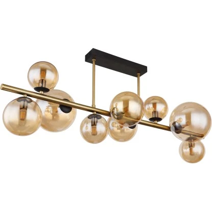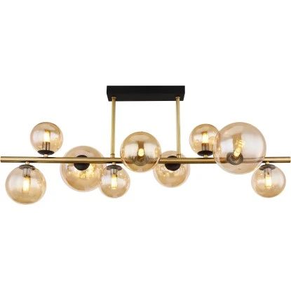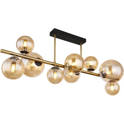 Diese faszinierende Deckenleuchte der Serie Riha begeistert durch tolles Design. An einer schmalen schwarzen Deckenhalterung verlaufen zwei messingfarbene Stangen senkrecht zu einer 87 cm langen vertikalen Metallstange (87×30 cm) bestückt mit neun G9 LED Leuchtmitteln und jeweils einen Glasschirm in Amber. Die G9 LED Leuchtmittel geben ein 3000 Kelvin warmweißes Licht ab und erschaffen somit eine angenehme Atmosphäre. Durch weitere Modelle dieser Serie können Sie Ihren Wohnbereich perfekt ergänzen.