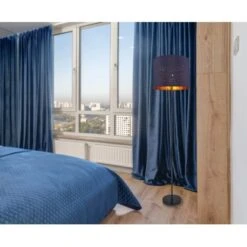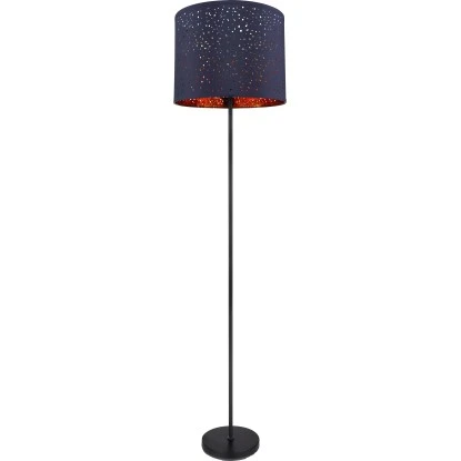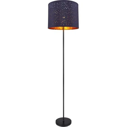 Diese wunderschöne Stehleuchte begeistert durch ein tolles Design. Aus einem schwarzen runden Sockel ragt eine 1,6 m lange Metallstange und mündet an einer E27 Fassung. An der E27 Fassung befindet sich ein blauer Schirm (Ø 40 cm) mit Musterstanzungen und kupferfarbener Innenseite. Die E27 Fassung ermöglicht Ihnen bis zu einer maximalen Leistung von 60 Watt, selbst über Lichtfarbe und Helligkeit zu bestimmen. Aufgrund von Langlebigkeit und Stromersparnis empfehlen wir LED Leuchtmittel.