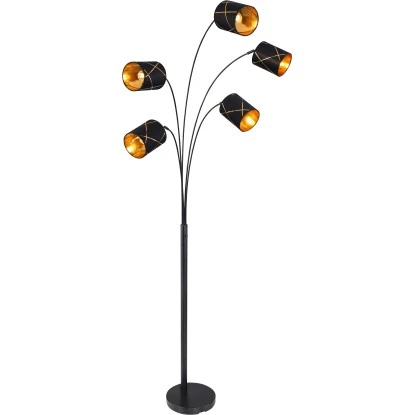 Die geschmackvolle fünf armige Stehleuchte BEMMO überzeugt mit den eleganten, schwarz- goldfarbenen Textilschirmen. Das Licht dieser wunderschönen Stehlampe reflektiert durch das an der Innenseite des Lampenschirms angebrachte goldfarbige Acryl wunderbar. Durch die freie Wahl der Leuchtmittel (exkl. E14 max. 25 W) entscheiden Sie in welcher Lichtfarbe Ihr Heim erstrahlt. Platziert neben dem Sofa oder dem Esstisch wird diese Leuchte zum echten Blickfang.