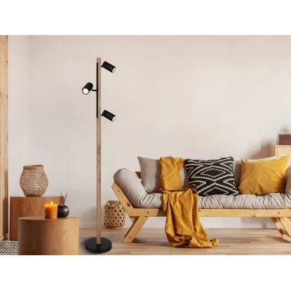 Diese Stehleuchte überzeugt durch schönes Design aus Metall und Holz. Aus einem runden Sockel in matt Schwarz ragt eine 1,5 m lange Holzstange an der sich drei GU10 LED Fassungen in unterschiedlichen Höhen befinden. Die GU10 LED Fassung ermöglicht Ihnen bis zu einer maximalen Leistung von 5 Watt, selbst über Lichtfarbe und Helligkeit zu bestimmen. Wir empfehlen aufgrund der Stromersparnis und Langlebigkeit ein LED-Leuchtmittel zu verwenden.