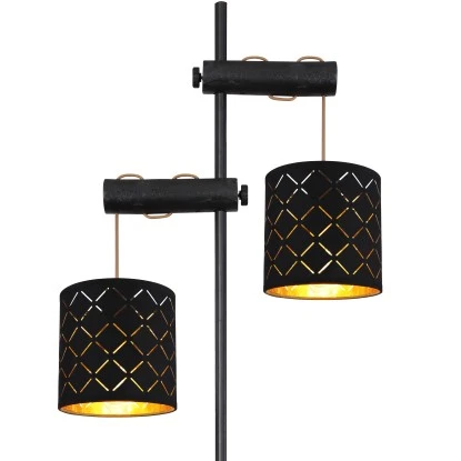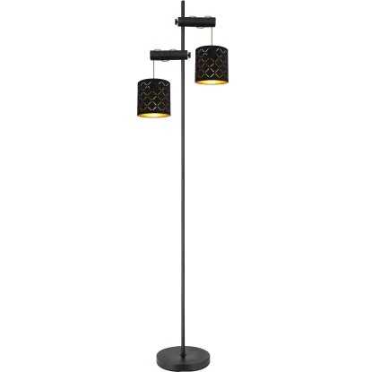 Die Stehleuchte aus der Serie Clarke von Globo überzeugt durch Ihr schönes Design aus Schwarz und Gold. Die Stehleuchte besteht aus 2 schwarz matten Schirmen mit einem Durchmesser von jeweils 15 cm mit Dekorstanzungen, welche jeweils mit einer E27-Fassung ausgestattet sind und an goldfarbenen Kabeln hängen. Diese sind an der 1,5 m hohen schwarz matten Metallstange höhenverstellbar. Mithilfe der E27-Fassung können Sie Leuchtmittel Ihrer Wahl, bis zu einer maximalen Leistung von 40 Watt, verwenden. Mit weiteren Modellen dieser Serie können Sie Ihren Wohnbereich verschönern.