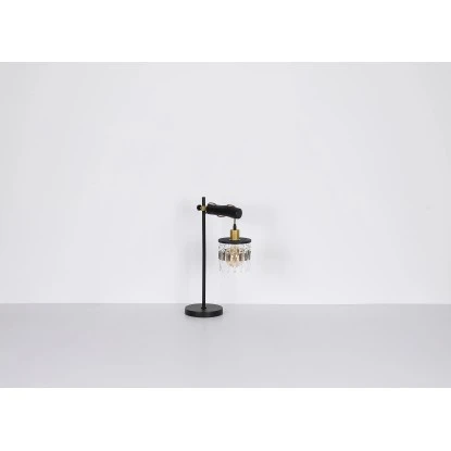 Diese Tischleuchte überzeugt durch ihr schönes Design aus Glaskristallen und den Farben Schwarz und Gold. Die Tischleuchte besteht aus einem Schirm mit rauchigen Glaskristallen welcher mit einer E27 Fassung ausgestattet ist und an einem goldfarbenem Kabel hängt. Diese ist außerdem an der knapp 55 cm schwarz matten Metallstange höhenverstellbar. Die E27 Fassung ermöglicht Ihnen, Leuchtmittel Ihrer Wahl bis zu einer maximalen Leistung von 40 Watt zu verwendet.