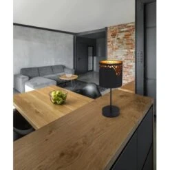 Diese Tischlampe aus der Ingeborg-Serie (Ø 15 cm) ergänzt Ihre Innenräume um eine elegante Lichtquelle. Die 35 cm große Tischleuchte besteht aus einem außen schwarz und innen golden getönten Textilschirm mit runden Stanzungen, welcher einem mattschwarzen Metallstab mit Sockel fixiert ist und mit einem E14-LED-Leuchtmittel Ihrer Wahl bestückt werden kann. Dadurch haben Sie die Möglichkeit, Lichtfarbe und Helligkeit individuell zu bestimmen. Mit dem inkludierten Schalter können Sie sie zudem bequem ein- und ausschalten Durch weitere Artikel dieser Serie können Sie in Ihren vier Wänden für ein stilvolles Ambiente sorgen.