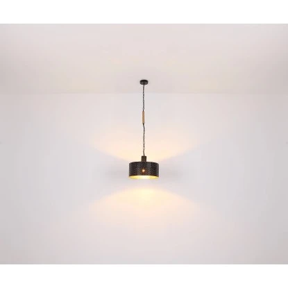 Diese moderne Tischleuchte der Serie RIELLY begeistert durch tolle Farbgebung aus Gold, Schwarz und Holzoptik. Aus einem runden Sockel ragt eine 31 cm lange Metallstange mit einem höhenverstellbaren MDF Balken in schöner Holzoptik, an dem sich eine E27 Fassung befindet. Diese wird von einem formschönen dekorativen Schirm in Schwarz und Gold ummantelt und kann mittels ON/OFF Schalter bedient werden. Die E27 Fassung ermöglicht Ihnen bis zu einer maximalen Leistung von 40 Watt, selbst über Lichtfarbe und Helligkeit zu bestimmen. Aufgrund von Langlebigkeit und Stromersparnis empfehlen wir LED Leuchtmittel.