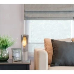 Die kompakt gebaute nickelmatte Tischleuchte Annika hat ein dezentes Design und kann dadurch in jeden Raum integriert werden. Der zylinderförmige Schirm (Ø 9 cm) ist aus einem verdunkelten Glas. Im eingeschalteten Zustand scheint das Leuchtmittel ganz zart durch. Ein Highlight dieser 30 cm hohen Leuchte ist, dass sie über einen Touch-Schalter verfügt. Dadurch können Sie die Leuchte ganz einfach Ein- und Ausschalten. Da die Leuchte mit einer E27-Fassung ausgestattet ist, können Sie das Leuchtmittel bis max. 25 Watt, sowie die Lichtfarbe und Lichtstärke bestimmen. Wir empfehlen LED-Leuchtmittel, aufgrund ihrer Stromersparnis und Langlebigkeit. Annika integriert sich wunderbar als Nachttischleuchte, kann aber auch auf Beistelltischen und Kommoden im Wohnbereich platziert werden – wo sie eine gemütliche Akzentbeleuchtung erzeugt.