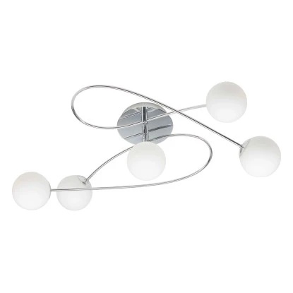 Weiße Opalglaskugeln und verchromte Arme, damit überzeugt diese formschöne Deckenleuchte. Die Leuchte ist für den Einsatz von Energiesparleuchtmitteln geeignet. Die Halogenleuchtmittel 5 x G9 33 Watt sind im Lieferumfang enthalten.