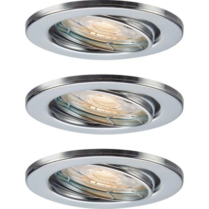 Für eine optimale Montage benötigt der LED-Spot eine Bohrung von Ø 68 mm. Das Außenmaß des Rahmes beläuft sich auf insgesamt Ø 86 mm. Die vorgesehene Einbautiefe beträgt 60 mm. In den Leuchtkörper ist eine austauschbare LED-Lampe des Typs GU10 integriert, die eine Leistungsaufnahme von 3,5 W besitzt. Dies ergibt ein warmweißes Licht bei 2.900 K und einen Lichtstrom von 330 lm. Die einfache Montage nehmen Sie durch einen bündigen Einbau vor, sodass nur der Leuchtenrahmen zu sehen ist. Der Lieferumfang beinhaltet ein 3er-Set inklusive der Leuchtmittel.