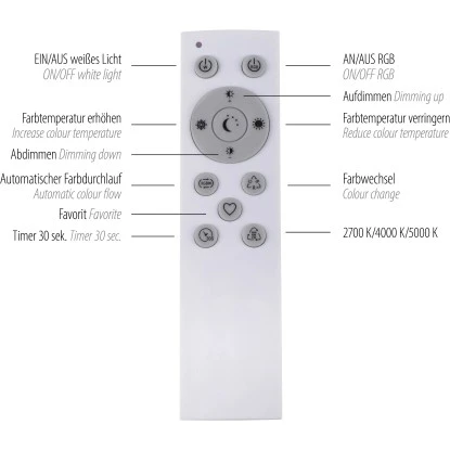 Das schlichte LED Deckenpaneel Gustav begeistert durch vielseitige Funktionen und ein schlichtes Design. Die Deckenleuchte kommt mit einer RGB-Backlight Funktion. Die Leuchte wird inklusive zwei LED-Boards sowie einer Infrarot Fernbedienung geliefert. Durch das weiße Kunststoffglas gibt die runde Leuchte ein angenehmes, blendfreies Licht ab. Bei dem Hauptlicht (Downlight) kann die Farbtemperatur von Warmweiß (2700 K) bis Tageslichtweiß (5000 K) ganz nach Ihren Belieben verstellt werden. Das Backlight können Sie durch den RGB Farbwechsel in einer bunten Farbe erstrahlen lassen. Darüber hinaus können Sie die Lichtintensität über die Dimmfunktion flexibel anpassen. Mittels der Memory Funktion können Sie Ihre Einstellungen für das nächste Einschalten speichern. Diese Steuerungen können Sie alle über die mitgelieferte Fernbedienung vornehmen. Die LED Deckenlampe verfügt zusätzlich über eine Timerfunktion, Nachlichtfunktion und einer Favoritentaste über die man seine Lieblingseinstellung speichern kann. Die Deckenleuchte hat eine Länge von 42,0 cm, eine Breite von 42 cm und eine Abhängung von lediglich 2,9 cm. Dank der verwendeten LED Technik ist das weiße Panel energiesparend und überzeugt mit einer geringen Wärmeentwicklung sowie hohen Lebensdauer.