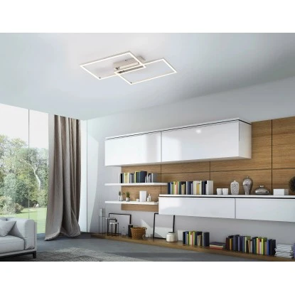 Die Deckenleuchte Iven besticht durch Ihr flaches, modernes Design. Die aus Stahl gefertigte Deckenleuchte wird inklusive zwei festverbauten 15 Watt LED-Leuchtmitteln geliefert. Jedes Leuchtmittel strahlt gemessen am LED-Board rund 1650 Lumen aus und Sie haben die Möglichkeit die Leuchte in der Farbtemperatur von 2700 Kelvin (Warmweiß) bis 5000 Kelvin (Neutralweiß) nach Belieben zu verstellen. Die Regulierung erfolgt über die im Lieferumfang enthaltene Infrarot-Fernbedienung. Das gemessene Gesamtlumen der Leuchte beträgt 1700 Lumen. Über die Fernbedienung lässt sich die Leuchte auch in Ihrer Lichtintensität stufenlos regulieren. Die Deckenleuchte ist mit einer Memory-Funktion ausgestattet so dass die letzte Einstellung der Leuchte gespeichert bleibt bis man die Einstellung wieder verändert. Die Leuchte hat eine Länge von 50,4 cm, eine Breite von 42 cm und eine Abhängung von 7 cm.