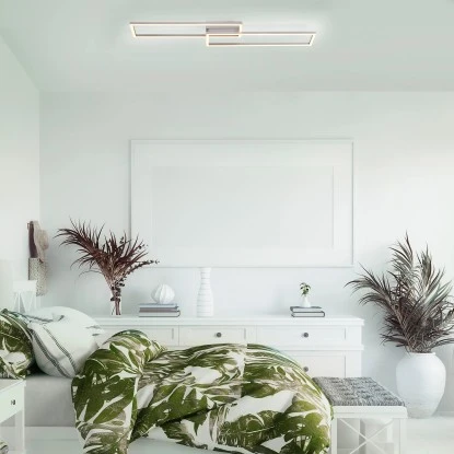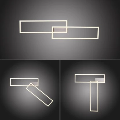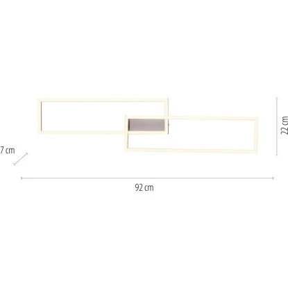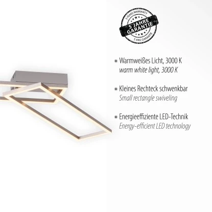 Die LED-Deckenleuchte Iven besticht durch ein modernes Design. Die Kombination aus Aluminium und robusten Kunststoff macht die Deckenleuchte zu einem Hingucker. Ein rechteckiger Rahmen der Leuchte ist dreh- und schwenkbar und so kann man sich immer wieder eine neue Optik schaffen. Die Leuchte wird mit zwei LED Leuchtmitteln geliefert, die in einer warmweißen Farbtemperatur von 3000 K erstrahlen. Die schlichte Lampe eignet sich ideal für die verschiedenste Räume wie Schlafzimmer, Wohnzimmer, Flur, Arbeitszimmer, Esszimmer oder Küche. Die Deckenleuchte hat eine Breite von 92,4 cm, eine Breite von 22 cm und eine Höhe von 7 cm