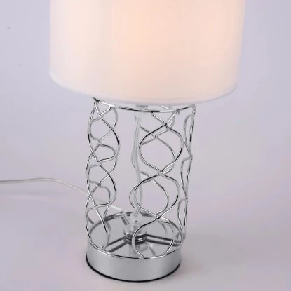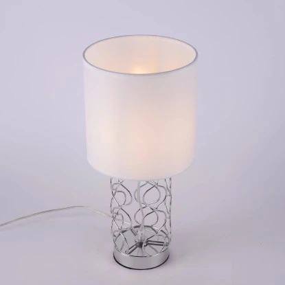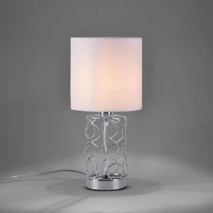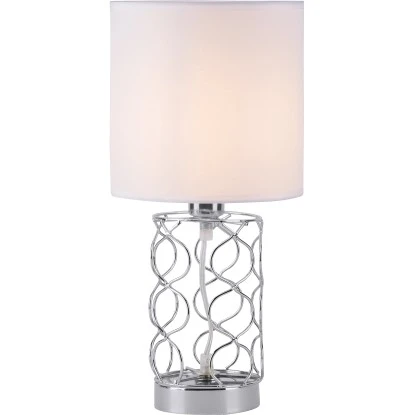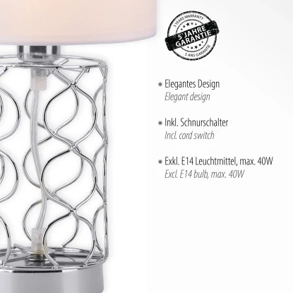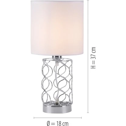 Ob auf dem Nachttisch, auf einer Fensterbank oder auf einem Möbelstück: Die Tischleuchte DEVA macht überall eine gute Figur. Der Fuß der Leuchte besteht aus einem geschwungenen Käfig aus glänzend silber lackiertem Metall wodurch die Leuchte sehr filigran und leicht wirkt. Darauf sitzt ein zylindrisch geformter Schirm aus weißem Stoff. Die Tischlampe können Sie individuell mit einem E14 Leuchtmittel (max. 40 Watt) bestücken. Die Leuchte hat einen Durchmesser von 18 cm und eine Höhe von 35 cm.