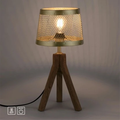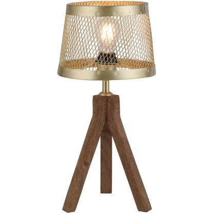 Die Tischleuchte FREDERIK ist hervorragend für eine stimmungsvolle Wohnraumbeleuchtung geeignet. Die Lampe vereint einen Messing matt farbenen Käfigschirm mit einem dreibeinigen Holzgestell. Aufgrund der Durchlässigkeit des Lampenschirms wirkt hier ein Filament-Leuchtmittel besonders stilecht. Das dekorative Design der Tischlampe mit dem Tripodgestell aus Holz harmoniert ganz besonders gut mit einem skandinavisch ausgerichteten Einrichtungsstil. Als Leuchtmittel kann jedes Leuchtmittel mit einer E27-Fassung und einer maximalen Leistung von 60 Watt eingesetzt werden. Die Leuchte hat einen Durchmesser von 20 cm und eine Höhe von 46 cm.