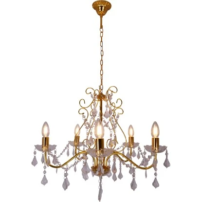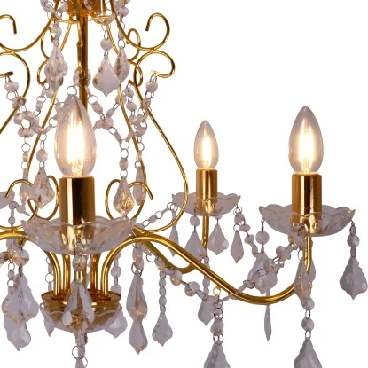 Der wunderschöne 5 flammige Näve Kronleuchter Lucia Gold mit Schmucksteinen Ø 60 cm ist mit seinem klassischen Design ein echter Hingucker. Die fünf Leuchtköpfe hängen an einer Metallstange, von dem sie im unteren Bereich spinnenförmig ausgehen. Die klaren-weißen Acrylbehänge verkörpern in Kombination zur goldenen Stange ein edles Design. Die Leuchte besitzt fünf Fassungen der Sockelgröße E14. Sie sorgen mit der Leuchtmittelauswahl für die richtige Lichtfarbe. Die Lampe weist die Schutzklasse IP20 auf.