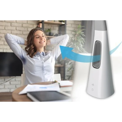 Die moderne LED-Tischlampe Ventu von Näve mit einem eingebauten Ventilator überzeugt durch ihr stilvolles Design und ist die ideale Beleuchtung für den modernen Schreibtisch im Büro oder im heimischen Arbeitszimmer. Für eine individuelle Einstellung und die Ausleuchtung bestimmter Bereiche auf dem Schreibtisch ist der Leuchtenkopf der etwa 40 cm hohen Lampe beweglich. Die Helligkeit des Lichts und auch die drei Stufen des blattlosen Lüfters sind über einen eingebauten Lichtdimmer mit Touchschalter genau nach Bedarf schaltbar. Das kaltweiße Licht der Lampe ist sehr hell und dadurch die ideale Beleuchtung zum Arbeiten.