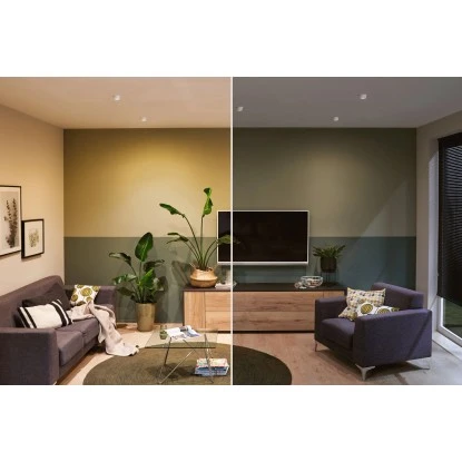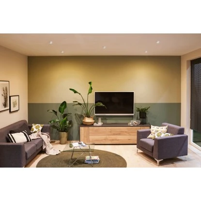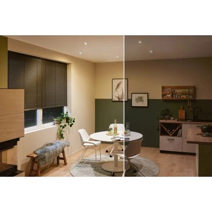 Die dekorativen Einbauleuchten Gil im 3er-Set in der Farbe Weiß matt, Eisen gebürstet sorgen mit ihrem zweifarbigen Design für Lichthighlights und setzen blendfreie Akzente an der Decke. Durch den hervorstehenden Dekozylinder wird eine geringere Einbautiefe im Vergleich zu den zurückgesetzten Lichtpunkten benötigt. Hat man sie entdeckt, möchte man gar nicht mehr wegschauen. Die Strahler punkten mit brillanter Technik: Die wechselbaren LED Coins liefern angenehm warmweißes Licht, lassen sich mit einem herkömmlichen Lichtschalter in drei Stufen dimmen und sind untereinander unendlich verkettbar. Sie benötigen einen Bohrdurchmesser von 62 mm.
