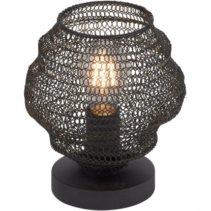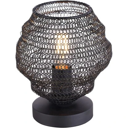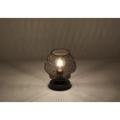 Mit der schwarzen Tischleuchte Kokon setzen Sie schöne Lichtakzente. Die Leuchte besteht aus einem schwarzen Sockel, der mit einem modernen Metallnetz-Schirm gekonnt in Szene gesetzt wird. Durch den Lampenschirm gibt die Tischlampe ein besonderes Lichtspiel wieder. Die Leuchte wird ohne ein Leuchtmittel geliefert und darf mit einem E27-Leuchtmittel bis maximal 60 Watt bestückt werden. Kombinieren Sie die Leuchte mit einem Leuchtmittel ganz nach Ihren Geschmack.