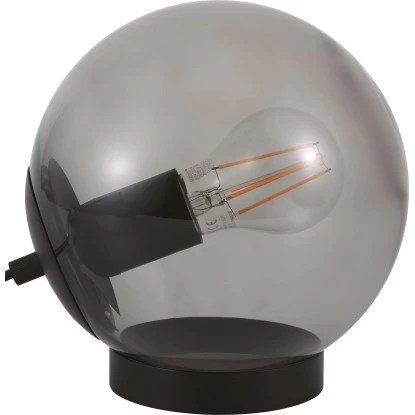 Die Tischleuchte eignet sich als schöner Blickfang und dient zum Ausleuchten von kleineren Tischen und Nischen. Ihre Höhe beträgt 18,5 cm und der Ø 18 cm. Der Lampenschirm besteht aus Rauchglas und das Gestell aus schwarzem, mattem Metall. Über einen Schalter kann die Leuchte bedient werden. Die einflammige Leuchte verfügt über eine Leistung von 40 W und ist kompatibel mit einer Fassung der Größe E27. Das passende LED-Leuchtmittel ist separat erhältlich.