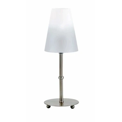 Die aus Stahl gefertigte Tischleuchte Bianca besitzt einen konischen Lampenschirm aus opal-matt-farbenem Glas. An einem angebrachten Touchdimmer lässt sich die Lichtstärke ganz einfach nach Belieben regulieren. Die Leuchte ist mit einer E14 Fassung für maximal 40 W ausgelegt. Leuchtmittel sind nicht im Lieferumfang enthalten.