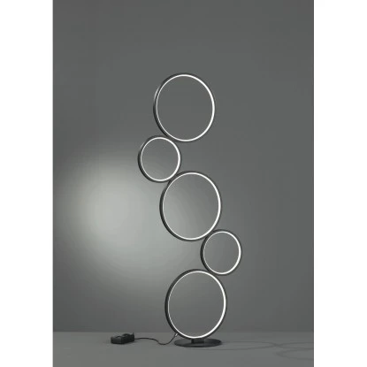 Mit ihren fünf aufeinander gestellten Ringen unterschiedlichen Durchmessers, ist die Stehleuchte Rondo ein echter Eyecatcher. Die Stehleuchte verfügt über einen integrierten Dimmer, der über den Schnurschalter gesteuert wird. Damit lässt sich die Helligkeit der in den jeweiligen Kreis-Innenseiten verbauten LEDs flexibel steuern. Die 115 cm hohe Stehleuchte ist ein wahres Deko-Element und wertet jeden Wohnraum stilvoll auf. Dank der Farbgestaltung in Schwarz matt, kann die Leuchte mit vielen Einrichtungsstilen kombiniert werden.