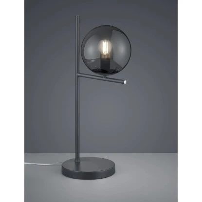 Die Tischleuchte hat eine Höhe von 52 cm und setzt Kommoden, Nachttische und Sideboards perfekt in Szene. Das puristisch-minimalistische Design der Lampe ist ein Mix aus edler Metall-Optik in Schwarz Matt kombiniert mit einem rauchfarbigen Glas.