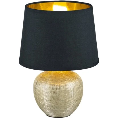 Die Tischleuchte Luxor besticht besonders durch ihr auffälliges Design. Der goldfarbene Körper der Leuchte harmoniert besonders gut mit dem schwarzen Stoffschirm, der innen ebenfalls gold ist. Die Leuchte ist 26 cm hoch und hat einen Durchmesser von 18 cm. Sie ist mit einem Schnurschalter ausgestattet, mit welchem sich die Tischleuchte einfach bedienen lässt.