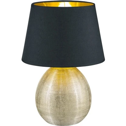 Die Tischleuchte Luxor überzeugt besonders durch ihr auffälliges Design. Der goldfarbene Körper der Leuchte harmoniert besonders gut mit dem schwarzen Stoffschirm, der innen ebenfalls gold ist. Die Leuchte ist 35 cm hoch und hat einen Durchmesser von 24 cm. Sie ist mit einem Schnurschalter ausgestattet, mit welchem sich diese Tischleuchte einfach bedienen lässt.